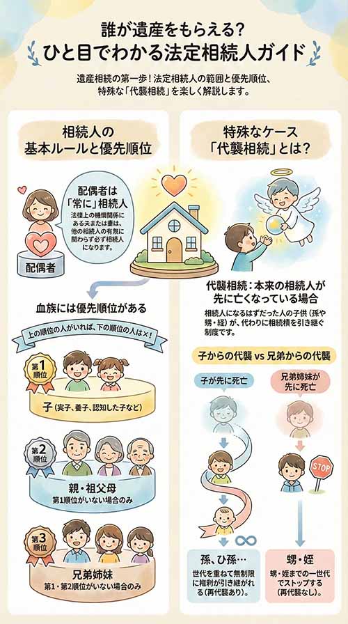 配偶者は「常に最前列」、血族は「順番待ち」です。第1順位の子がいるのに、第3順位の兄弟が遺産を主張することは、原則としてできません。